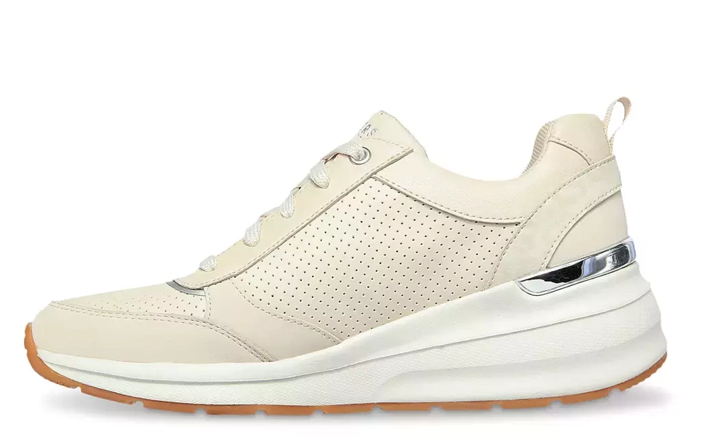 SKECHERS BILLION SUBTLE SPOTS  - sportowy styl w połączeniu z komfortem. Buty do noszenia na co dzień. Cholewka z gładkiej perforowanej syntetycznej skóry z logotypami producenta i syntetycznymi nakładkami. Wewnątrz wkładka chłodzona powietrzem z pamięcią kształtu z pianki Air-Cooled Memory Foam®  . Wkładka Wedge Fit z ukrytym klinem o wysokości 2,5cm.