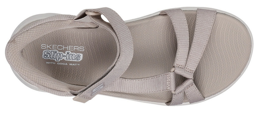 • SKECHERS Slip-ins GO WALK Flex Sandal - Illuminate - sandały zaprojektowane z wykorzystaniem poduszki Heel Pillow™, mają cholewkę z siateczki z regulowanym paskiem na podbiciu, wyprofilowaną wkładką Goga Mat®, lekką amortyzacją ULTRA GO® i zapiętkiem.
