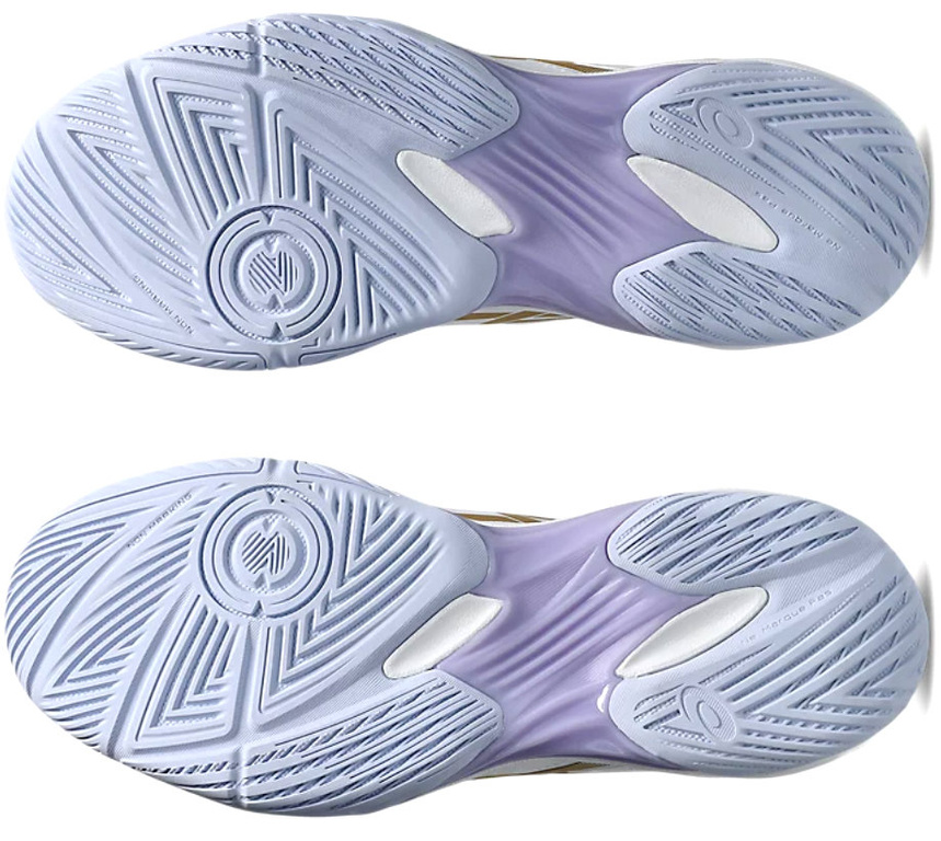 Zawijana wstawka w okolicy pięty zwiększa obszar styku podczas fazy lądowania, pomagając uzyskać płynniejsze lądowanie. Elastyczne żłobienia w bieżniku uzupełnione są o przyczepny wzór po bokach, zwiększający elastyczność na korcie.