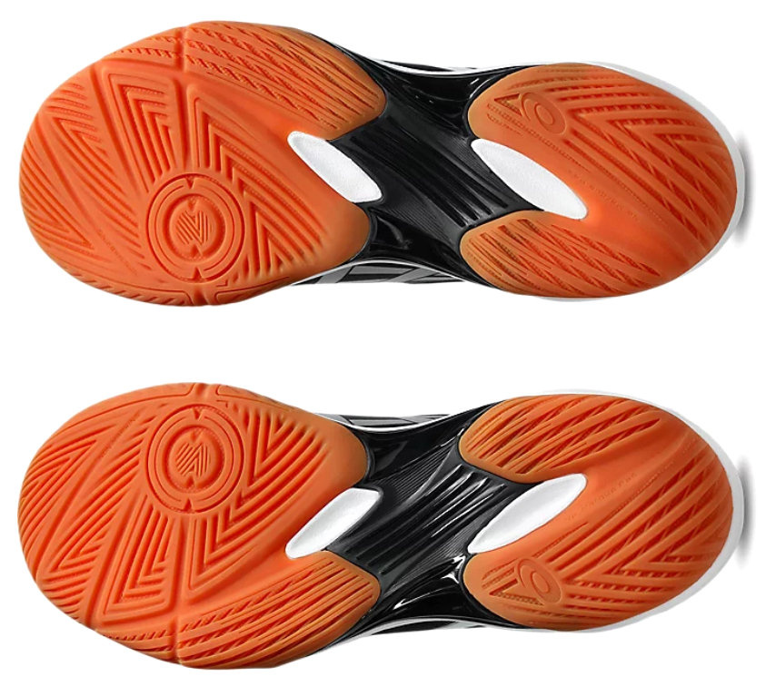 Zawijana wstawka w okolicy pięty zwiększa obszar styku podczas fazy lądowania, pomagając uzyskać płynniejsze lądowanie. Elastyczne żłobienia w bieżniku uzupełnione są o przyczepny wzór po bokach, zwiększający elastyczność na korcie.