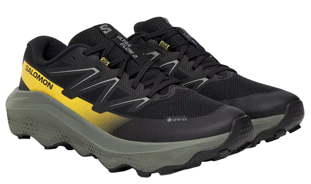 SALOMON ULTRA FLOW 2 GTX  - buty oferujące amortyzację jak do biegów ulicznych, lecz sprawiające wrażenie, jakby stworzono je na szlak. Model jest miękki, ma wyższą podeszwę i doskonale sprawdza się zarówno na bieżni, jak i w terenie, bez względu na częstotliwość, dystans czy warunki atmosferyczne. Połączenie miękkich materiałów cholewki i podeszwy zewnętrznej do terenu mieszanego oferuje optymalne dopasowanie do ukształtowania.