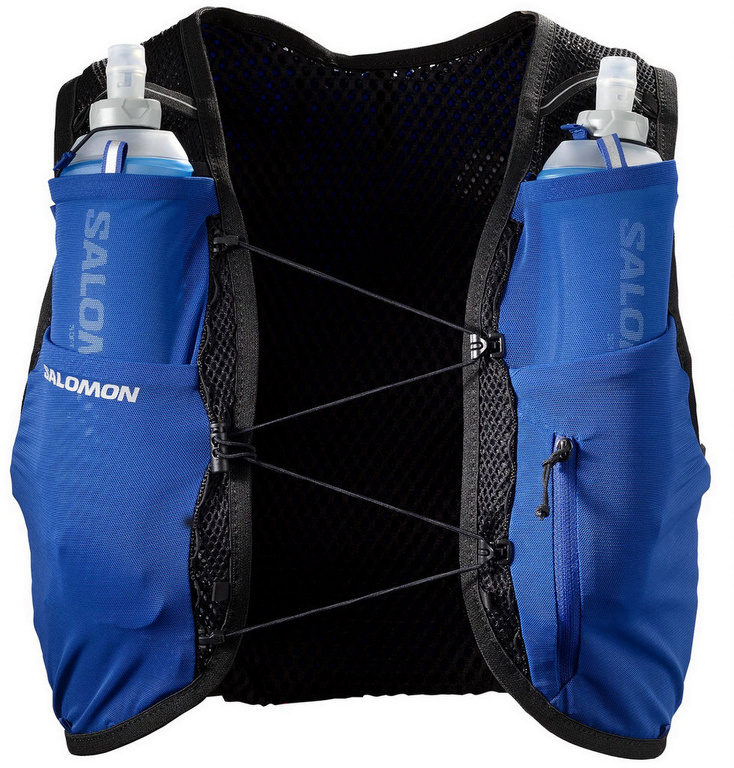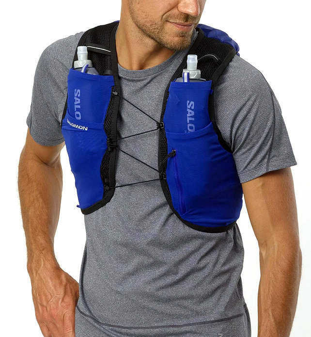 Kieszenie przednie, przeznaczone na miękkie bidony marki Salomon, ograniczają podskakiwanie. Górne elastyczne pętle zabezpieczają bidony i utrzymują je w zasięgu ręki.
