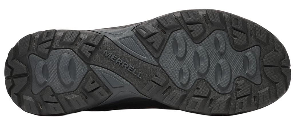W bucie zastosowano podeszwy Merrell pokryte wysokiej jakości warstwą antypoślizgowej gumy odpornej na ścieranie. Doskonale wyprofilowana podeszwa zapewnia komfort i wygodę podczas przemieszczania się. Zapewniają nadzwyczajną przyczepność oraz doskonale amortyzują i tłumią wstrząsy, a także oddają energię przy wybiciu. Dzięki specjalnej rzeźbie bieżnika uzyskano doskonały efekt samooczyszczania się podeszwy z piasku, błota czy gliny.
